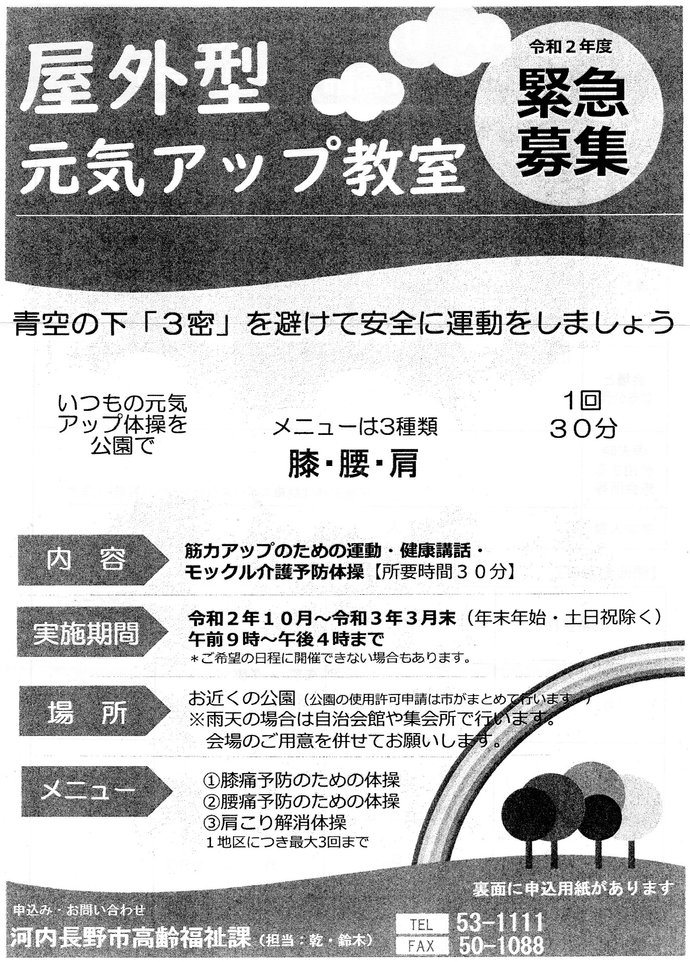 8月3日加賀田公民館での意見交換会の折に「元気アップ講師は屋内での実施が想定されていると思うが屋外で実施できるようなプログラムは用意されていますか?」との意見が出されておりましたが今回、河内長野市高齢福祉課から「屋外型 元気アップ教室」の緊急募集が出ましたのでご案内させていただきます。